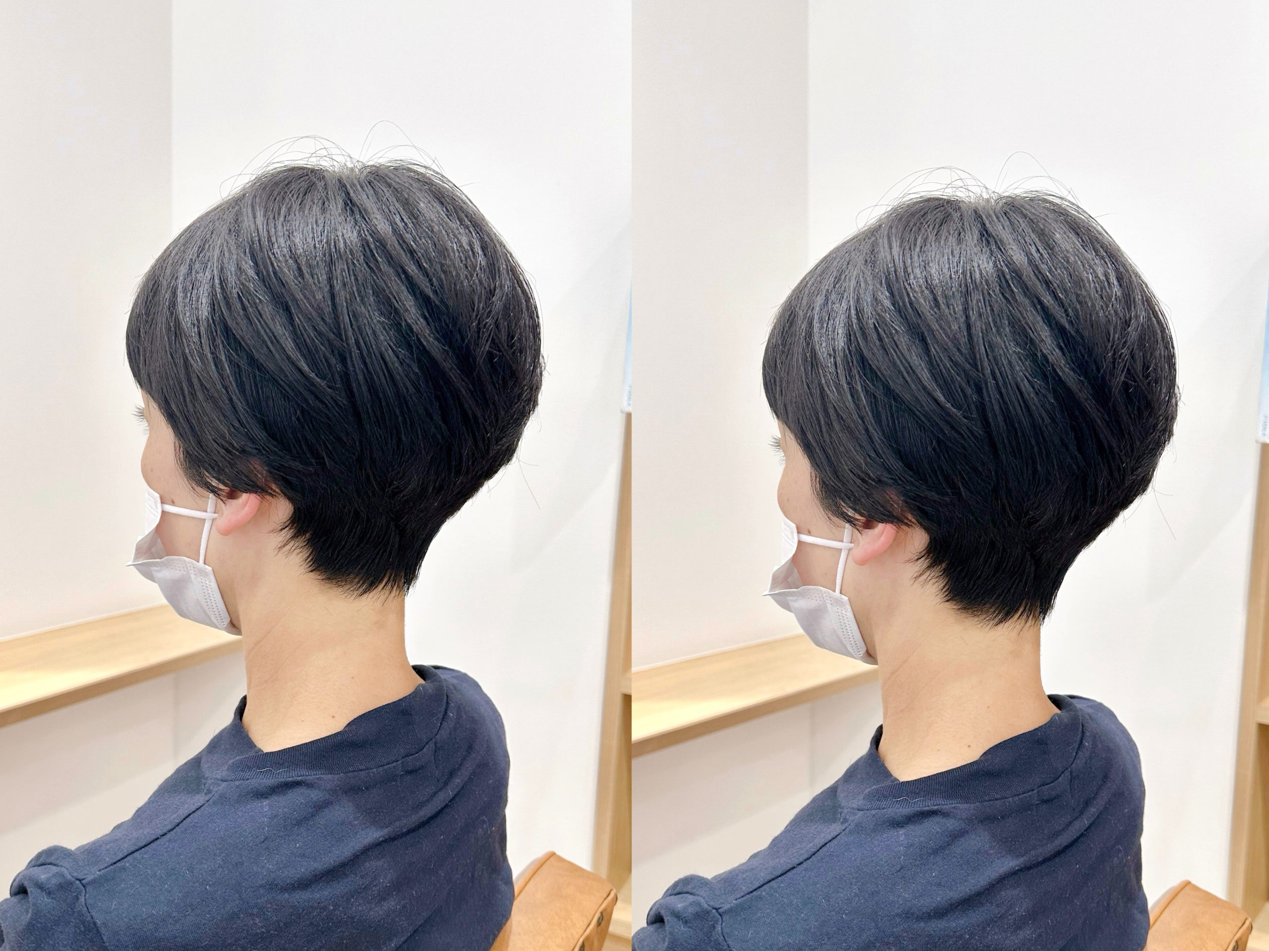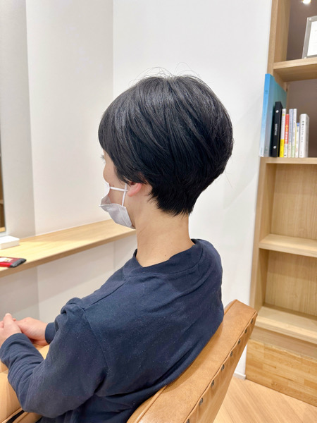 今回のスタイルは、サイドを耳半分ほどの長さに設定し、襟足は刈り上げず自然に首に沿わせることで、柔らかさと女性らしさを残したショートヘアです。