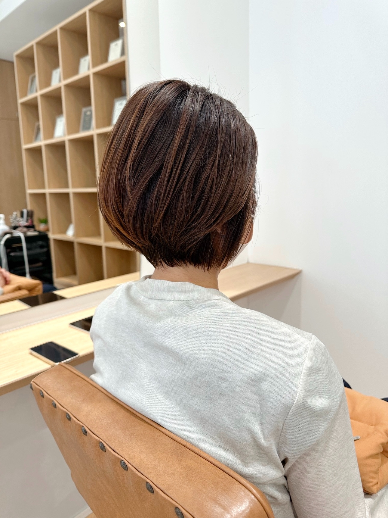 ひし形レイヤーボブは内側の収まりを整えることで、後ろ姿も横顔も美しく見えるよう仕上げています。
