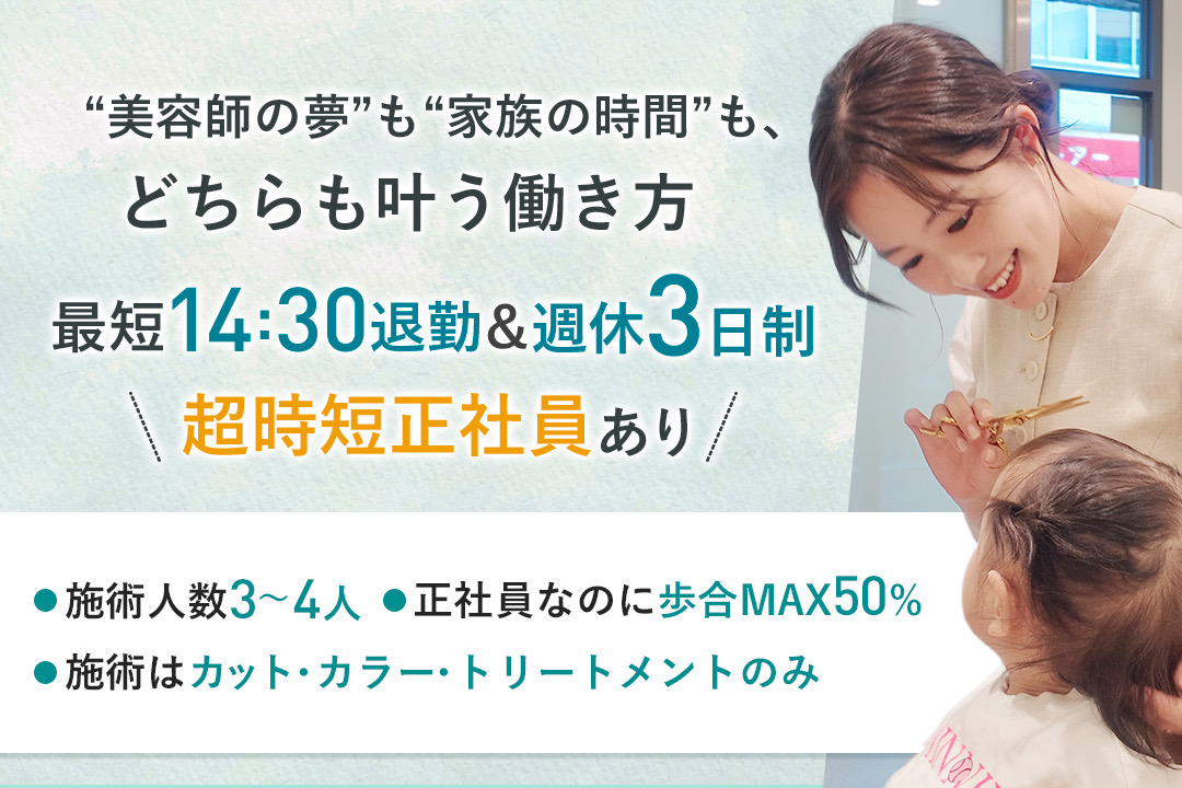 - 技術に不安がある→ブランク復帰も歓迎!覚えるカットは2スタイルのみ!(不安なくスタート可能)